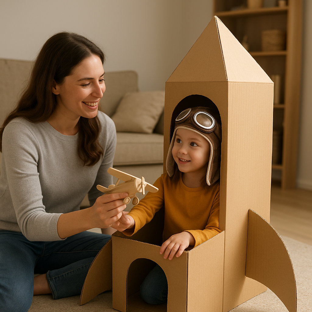- Zabawa konstrukcyjna: klocki, patyczki, tekturowe pudełka. Pozwalają budować modele, rozwijając umiejętność planowania przestrzennego.